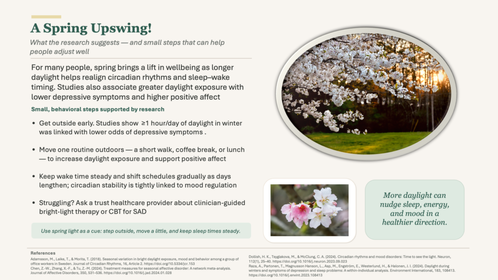 For many people, spring brings a lift in wellbeing as longer daylight helps realign circadian rhythms and sleep–wake timing. Studies also associate greater daylight exposure with lower depressive symptoms and higher positive affect.